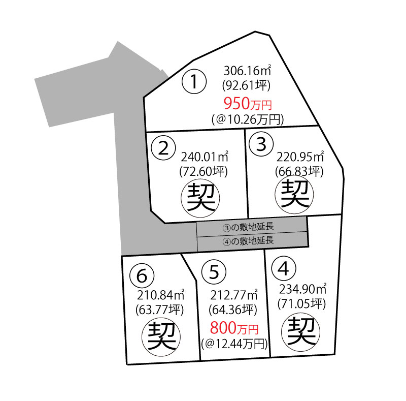 | ①950万円⑤800万円 | ①306.16㎡(92.61坪)⑤212.77㎡(64.36坪) |