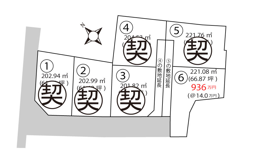 | ⑤1,040万円 ⑥936万円 | ⑤ 221.76 ㎡ (67.08 坪) ⑥ 221.08 ㎡ (66.87 坪) |