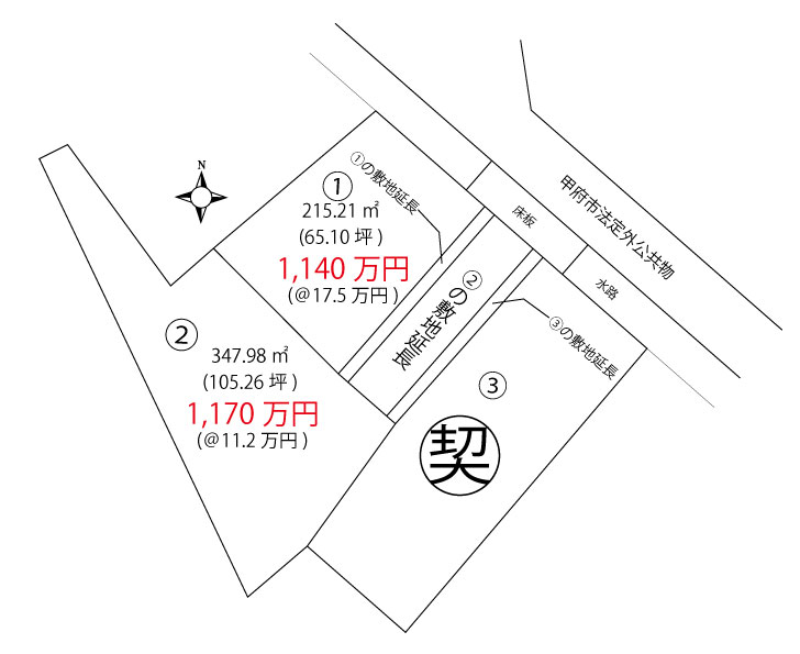 | 備考 | ※確定測量後実測清算あり ※敷地延長部分は未舗装になります (①②③の買主の条件が合えば売主が舗装します。) ※埋蔵文化財包蔵地 |