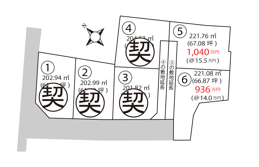 | ⑤1,040万円 ⑥936万円 | ⑤ 221.76 ㎡ (67.08 坪) ⑥ 221.08 ㎡ (66.87 坪) |