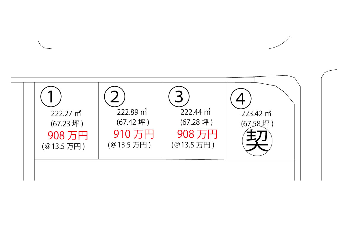| 908 万円~910万円 | 222.27㎡ (67.23坪)~222.89 ㎡ (67.42 坪) |